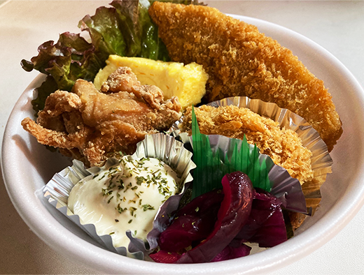 塩鮭・からあげ(4個)・卵焼き・副菜2種類・漬物が入った、麦わら特製のお弁当。メインのおかずが3種類とボリュームたっぷりです。
